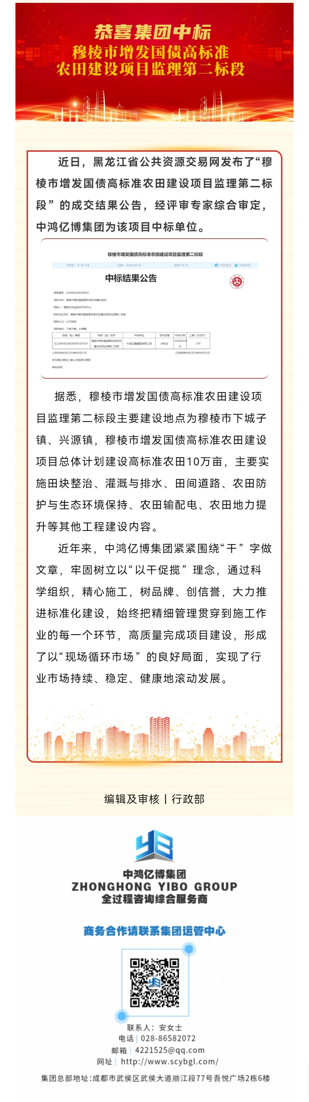 亿博动态丨喜报来袭—恭喜集团中标“穆棱市增发国债高标准农田建设项目监理第二标段”