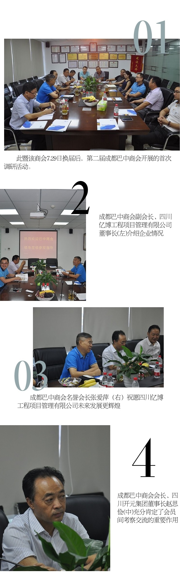 昨日,成都巴中商会名誉会长张爱萍,常务副会长杜光礼,监事长陈立,副会长彭勇、吴建恒、谷宇,秘书长马有举,副秘书长张雄等一行,在赵思俭会长的率领下,深入四川亿博工程项目管理有限公司进行考察调研。
