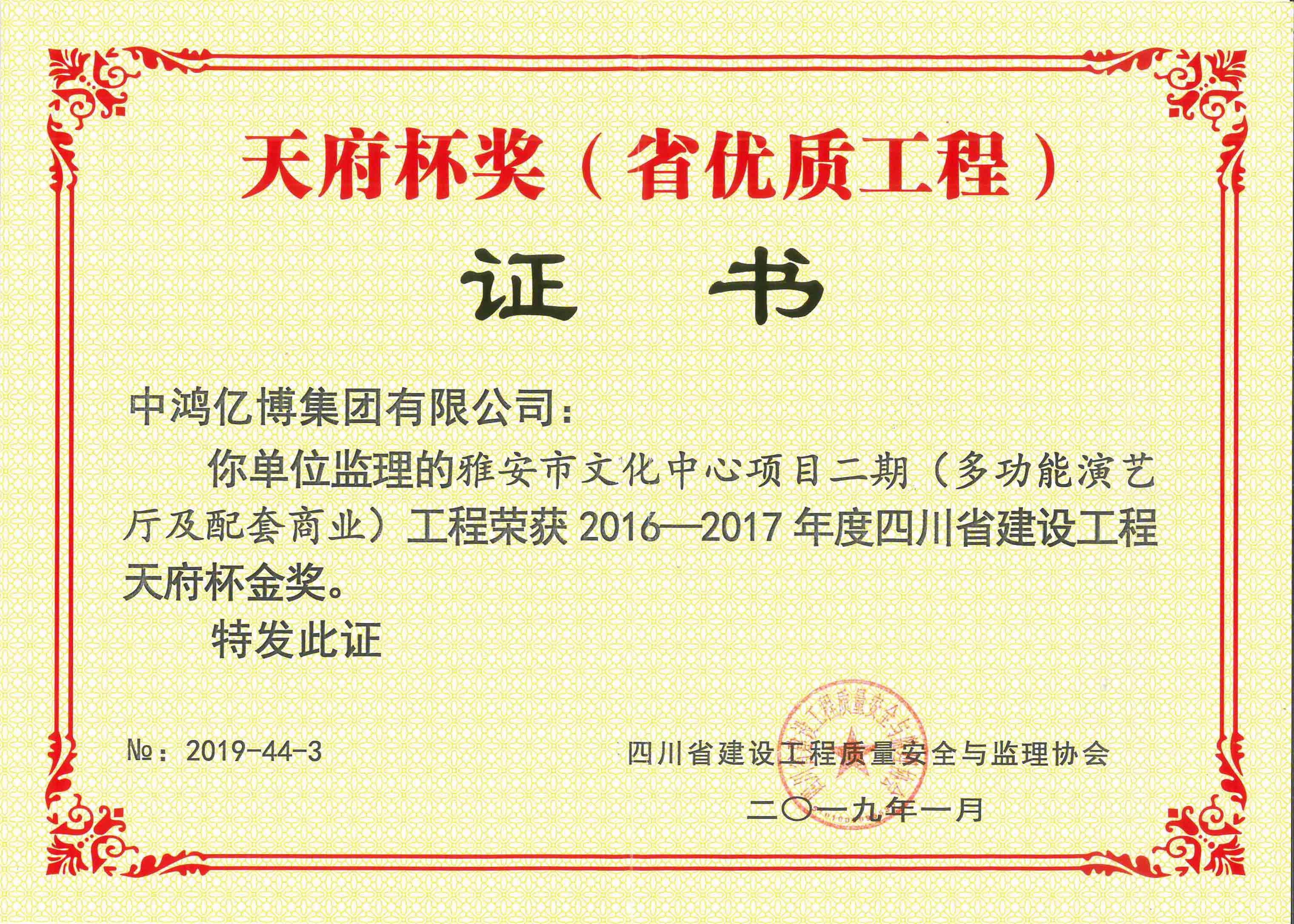 由我集团监理的雅安市文化中心项目二期工程(多功能演艺厅及配套商业),从众多参与角逐四川省建筑行业建设工程质量最高荣誉天府杯的项目中脱颖而出,荣获2016-2017年度四川省建设工程天府杯金奖。