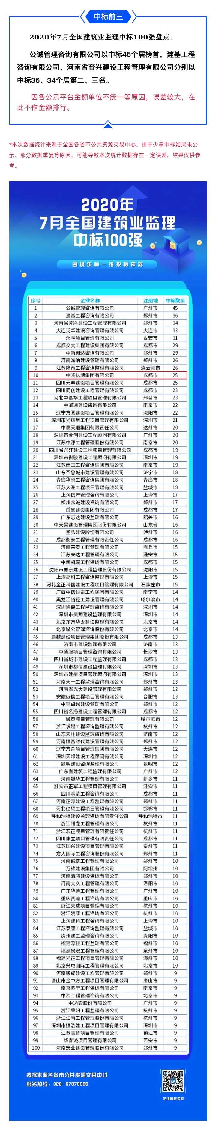 集团挺进2020年7月建筑业监理中标数量全国前十强