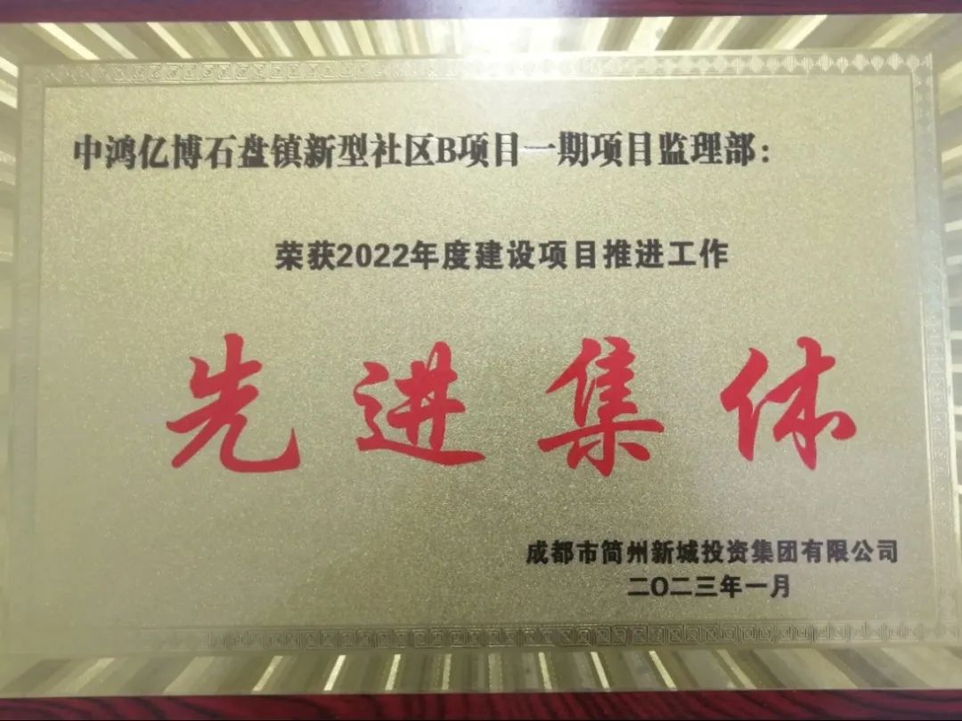 近日,由集团提供监理服务的“石盘镇新型社区B项目(一期)”获评简投集团2022年度建设项目推进工作“先进集体”称号。