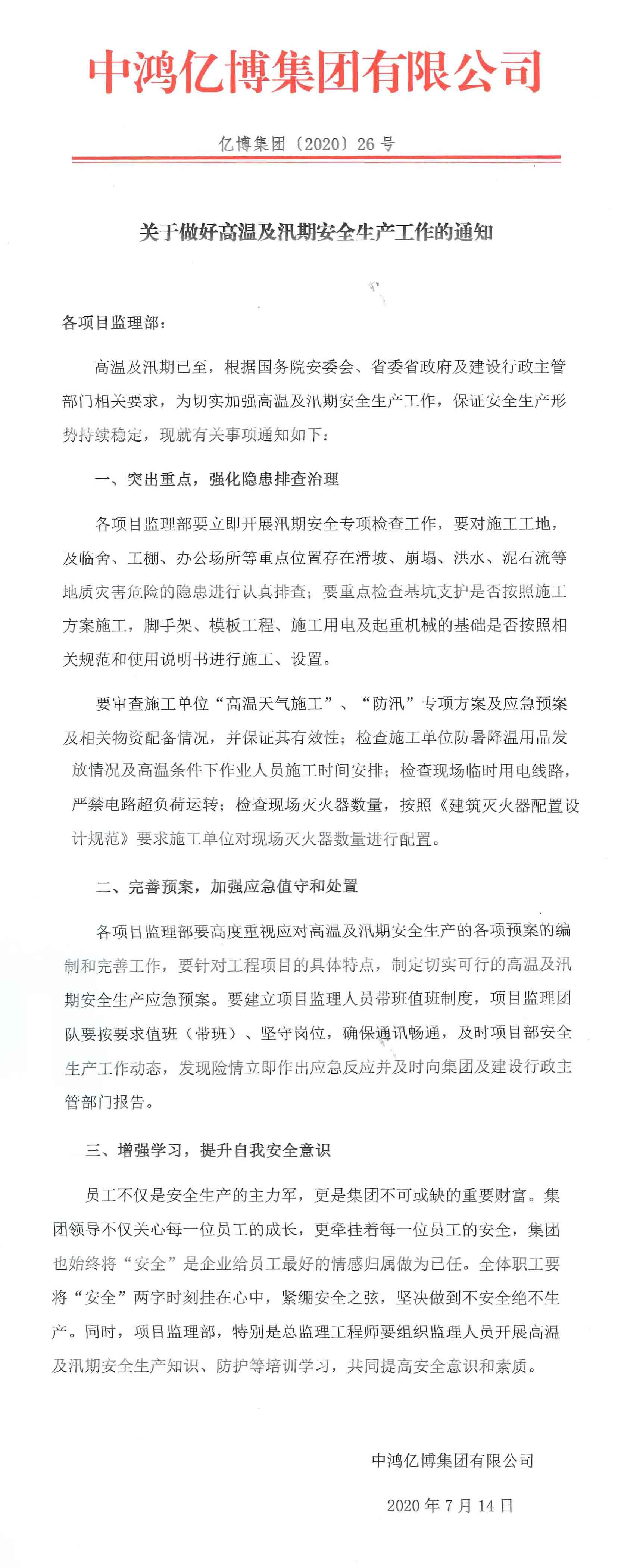 未雨绸缪,提前做好准备。汛期来临前,集团提早谋划,及时印发了《关于做好高温及汛期安全生产工作的通知》等文件通知,要求集团各部门、各项目密切关注雨水情况,做好汛期应急预案,按照抓早、抓紧、抓好的要求,全面开展防汛抢险工作大检查,认真查找薄弱环节,及时发现问题、解决问题。
