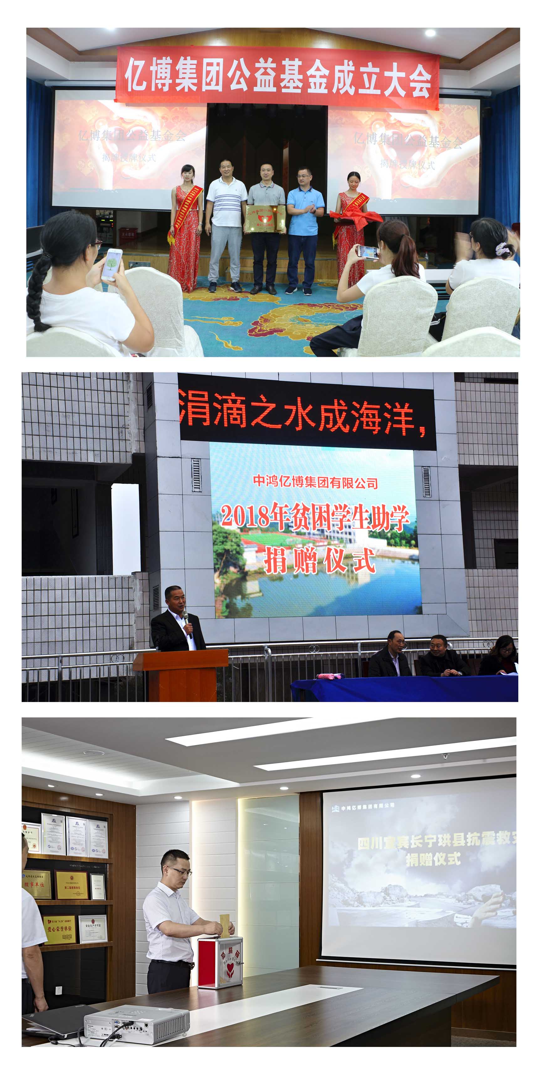 亿博集团自成立以来,始终秉承“真诚务实、诚信经营、科学管理、精致服务”的经营理念,企业在自身发展的同时,积极投身公益事业。亿博公益基金会从成立至今,对外捐赠达180余万元,完成了各类社会助学、救助贫困、抗震救灾、关爱老人等多方面的慈善资助。亿博公益基金会将会一直秉承“扶弱济困、救助孤寡、关爱单亲、照顾留守、帮助员工”的宗旨,长期坚持开展扶贫、助学、助困等活动,主动传递社会正能量。